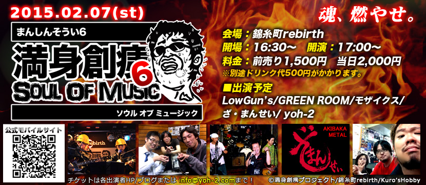 2015年2月7日(土)、錦糸町rebirthにて開催!yoh-2のホームスタジオPRIMEのマスター率いる「ざ・まんせい」超速ハードコア「モザイクス」がついに満身創痍初登場!そしてLowGun’sの「rebirth音頭」が炸裂!